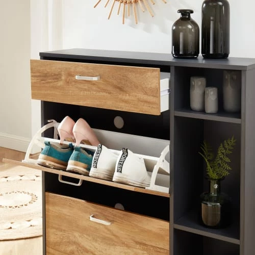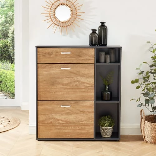 Meuble à chaussures LAZARE – 2 portes, 1 tiroir et 3 niches – structure en panneaux de particules – revêtement en papier décor noir et coloris bois – 4 pieds en MDF – Pouvant contenir entre 8 et 12 paires de chaussures – Dimensions : L90 x P23,5 x H101,5cm – Dimensions tiroir : L59.5 x P20.5 x H16cm – Dimensions portes : L59.5 x P20.5 x H39cm – Dimensions niches : L25.2 x P22 x H16 / 39 cm.