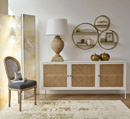 L’exotique chic débarque sur le paravent imprimé feuillage blanc et doré GOLDEN OASIS. Ses imprimés feuilles de palmier sont modernisés grâce à leur coloris doré, une touche de brillance élégante. Dans un intérieur contemporain ou dans une déco qui s’inspire des tropiques, ce paravent attirera tous les regards. N’ayez pas peur de lui offrir un petit esprit Palm Spring en l’intégrant à une déco qui mélange des teintes de bleu et de jaune pâle. Son look ne ressortira que mieux !