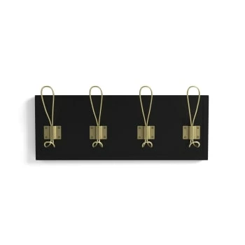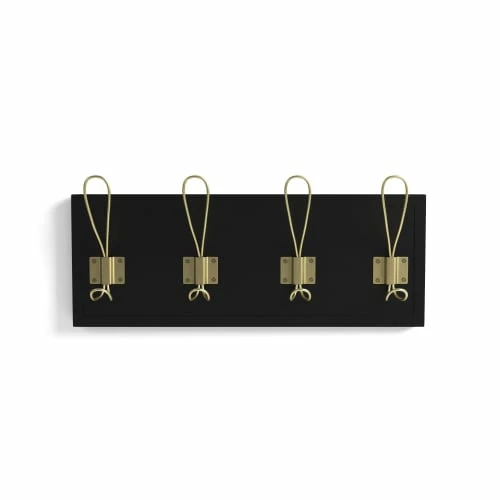 La patère Ariane est un panneau de bois rectangulaire, sur lequel sont fixés à l’aide d’appliques en métal 4 crochets métalliques. Chaque crochet est constitué de deux parties : une large boucle en haut et une plus petite en bas, afin d’y accrocher un maximum d’objets.